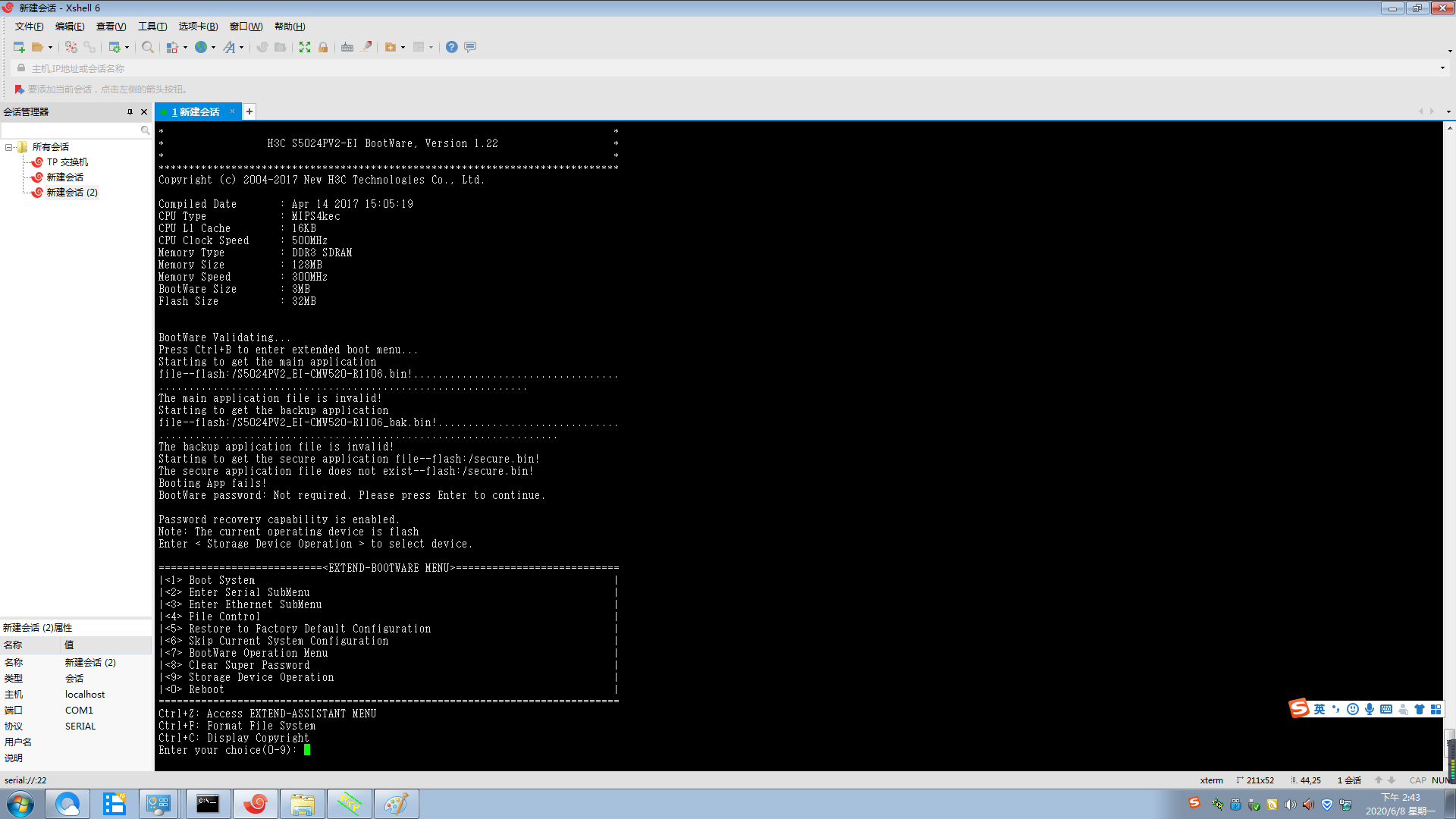 型号:S5024PV2-EI交换机开机一直自动进BOOTWARE菜单