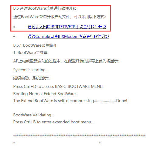 BootWare Validating...Press Ctrl+B to access EXTENDED-BOOTWARE MENU...Loading the main boot and system image files...The system image does not exist!Loading the backup boot and system image files...The image does not exist!Booting image fails!Trying to get the IP address from the DHCP server......Getting IP Address Failed, the system will reboot. [State : Idle] Reset request, rebooting the APRebooting......System is starting...Press Ctrl+D to access BASIC-BOOTWARE MENUBooting Normal Extend BootWareThe Extend BootWare is self-decompressing.................................Done!***************************************************************************** ** H3C WAP722S BootWare, Version 7.11 ** *****************************************************************************Copyright (c) 2004-2017 New H3C Technologies Co., Ltd.Compiled Date : Dec 19 2017CPU Type : ATHEROS AR9563CPU L1 Cache : 32KBCPU Clock Speed : 775MHzMemory Type : SDRAMMemory Size : 128MBMemory Speed : 560MHzBootWare Size : 512KBFlash Size : 16MBPCB Version : Ver.ABootWare Validating...Press Ctrl+B to access EXTENDED-BOOTWARE MENU...Loading the main boot and system image files...The system image does not exist!Loading the backup boot and system image files...The image does not exist!Booting image fails!Trying to get the IP address from the DHCP server......刷了FAT后进不去