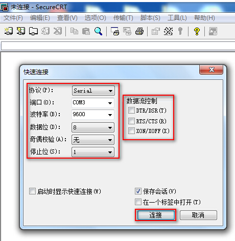 # 双击运行SecureCRT软件,找到【文件】菜单下【快速连接】选项,如下图,协议选Serial,端口选com3,波特率为9600,数据位为8,奇偶校验无,停止位为1,最后点击【连接】。