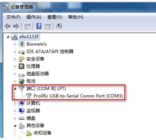 # 右击【计算机】选择【属性】--【设备管理器】--【端口】,查看确认电脑上使用的通信端口,本案例中使用COM3。