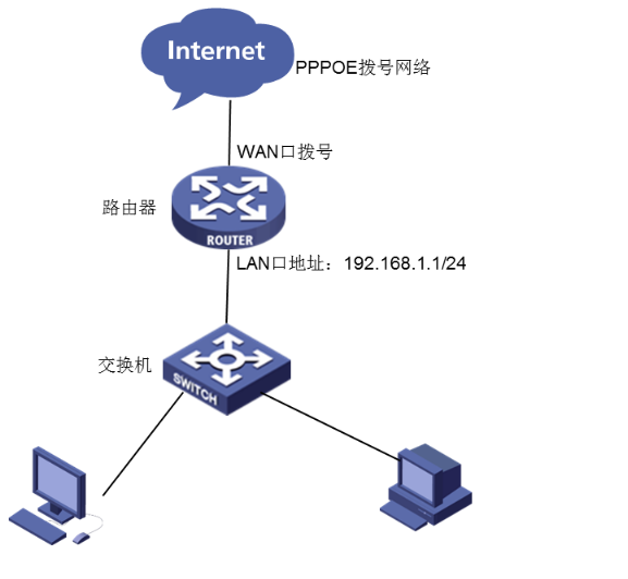 将路由器部署在互联网出口,使用拨号宽带线路接入互联网,运营商提供的拨号账号为:abc,密码为:abc123456。路由器使用WAN口接入运营商,使用LAN接口连接内部网络,内部网络使用192.168.1.0网段,内网终端可以自动获取到地址并可以访问互联网。