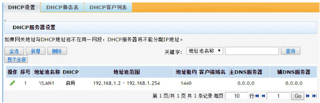 单击 【接口管理】--【DHCP设置】--【DHCP设置】,设备默认开启了地址池范围为192.168.1.2-192.168.1.254的DHCP服务器,无需配置。