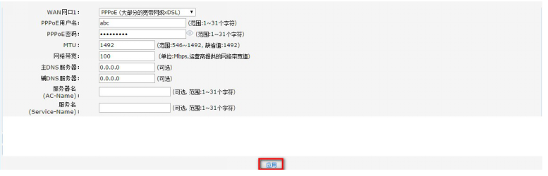 单击【接口管理】--【WAN设置】--【连接到因特网】,WAN网口1选择PPPoE,运营商提供PPPoE用户名为adc PPPoE密码为abc123456 最后点击【应用】。