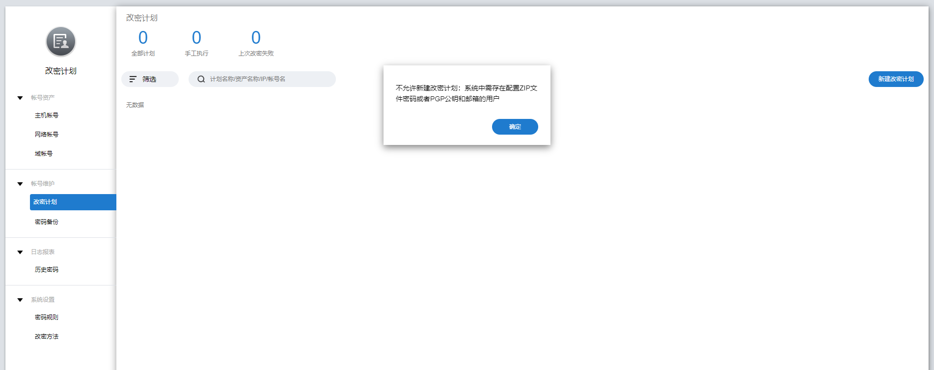 \\配置改密计划,设备要将密码备份文件发给用户邮箱或者上传到文件服务器,所以需要配置某个用户邮箱用于接收密码文件,该文件为ZIP格式,需要设置ZIP密码用户解压。给某个用户填写一个邮箱并配置ZIP文件密码即可解决。完整过程可参考典型配置里的windows用户改密。链接
