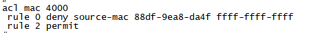 [SW1-acl-mac-4000]rule 0 deny source-mac 7844-E538-0306 FFFF-FF00-0000