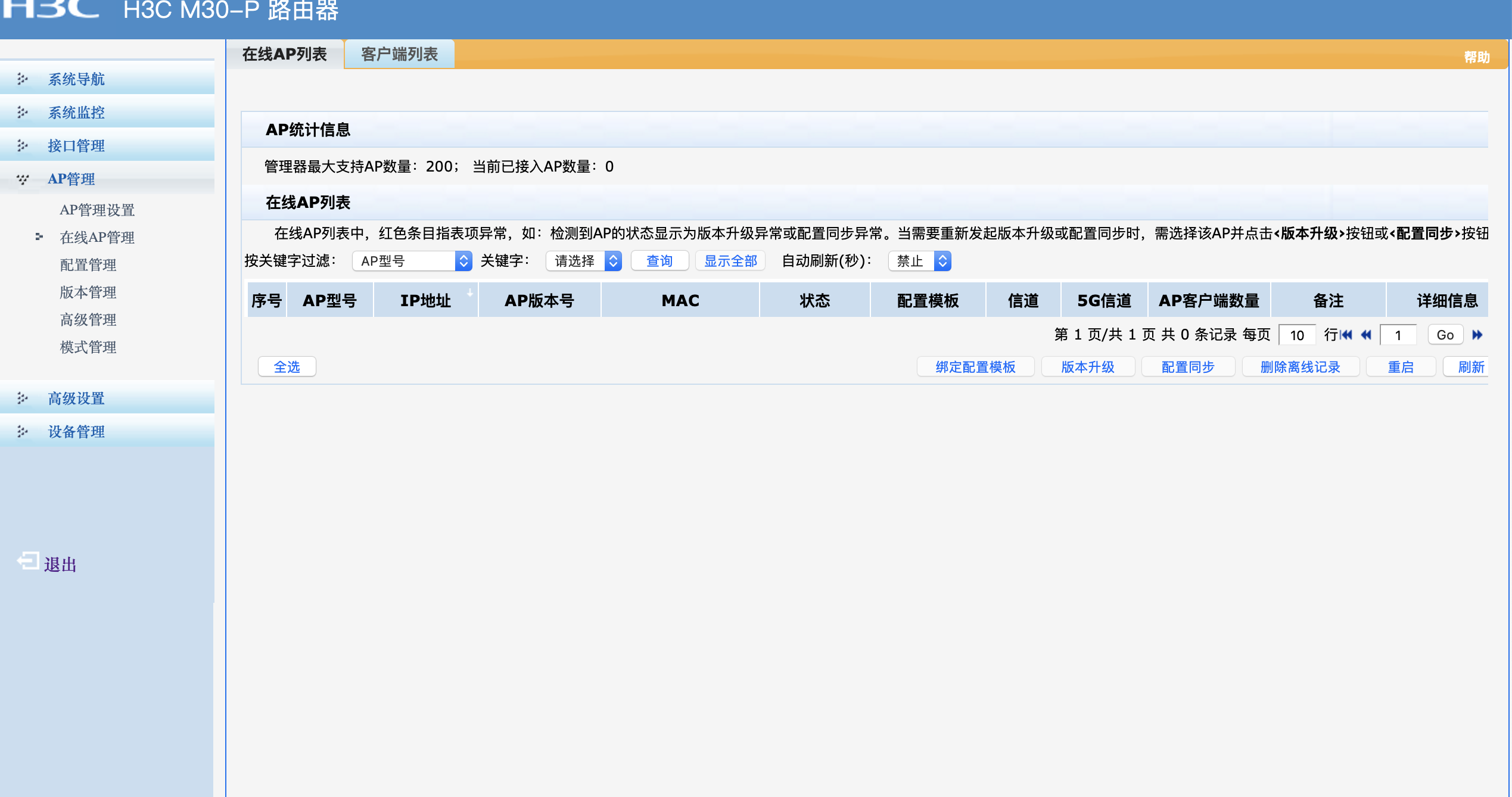 a60(ap)+m30-p(ac控制器)+s9gp交换机+软路由 m30-p已设为ac模式,m30-p设为192.168.2.X网段,主路由器为192.168.2.1. 设置好后m30 p管理界面正常跳出5个a60的ap信息(本人一共就5个),但是重启设备m30p后,界面无任何ap信息。如图。ap还在按照之前配置的工作中,重启交换机和控制器和路由,也是没有任何ap信息。