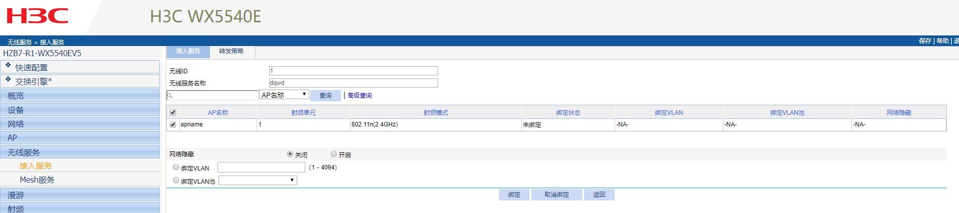 射频口绑定服务模板, 无线服务>接入服务>找到已经配置的服务模板,操作里面有个绑定的链接,点击进去。选择新增AP的视频接口,绑定