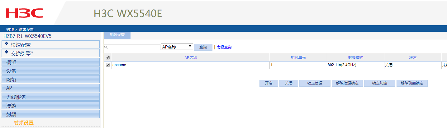打开射频接口。 射频>射频设置,选中新增AP射频口,开启