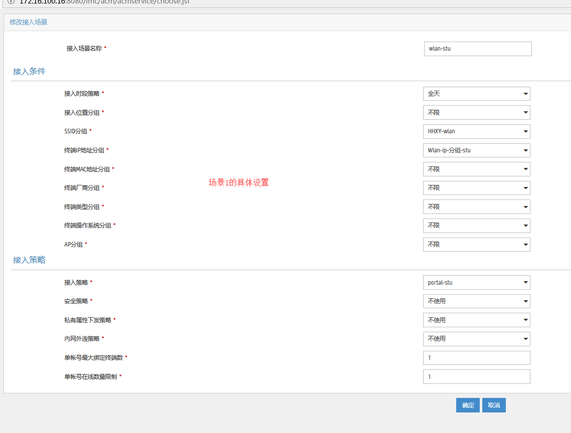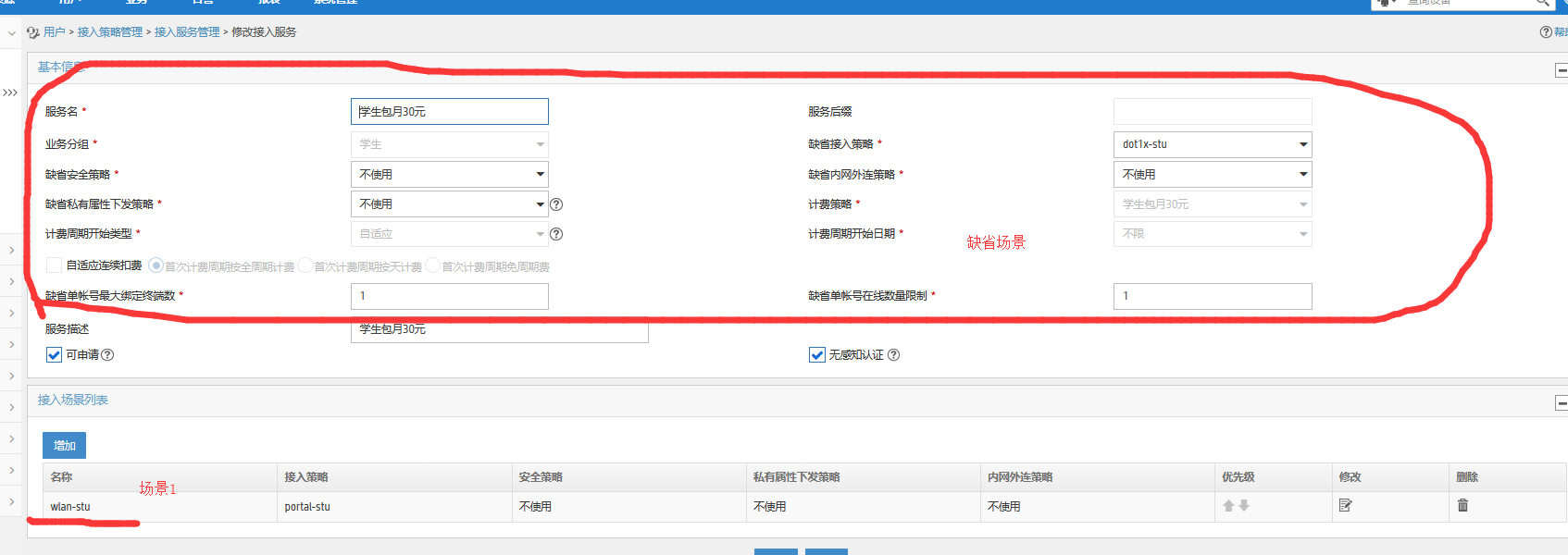 我校在接入服务中设置了两个场景,具体看截图,场景1()有筛选条件:根据接入ip地址筛选,是给我们学校无线用户用的场景,最大允许一个用户在线;