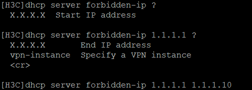 dhcp server forbidden-ip 1.1.1.1 1.1.1.20