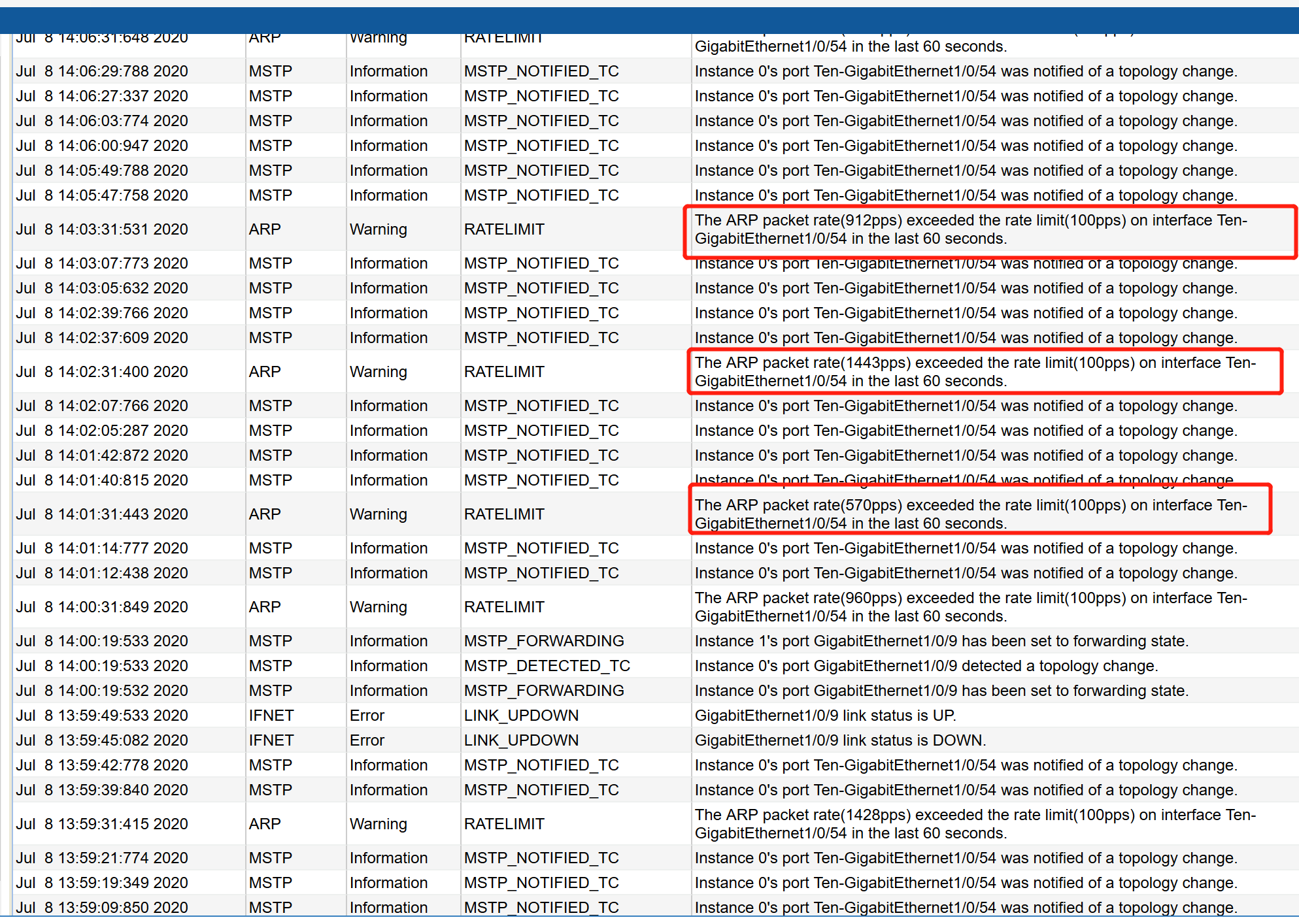 这表示端口收到了TC,去Ten1/0/54这个端口连接的设备上查,一级一级找下去