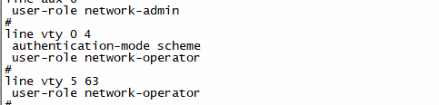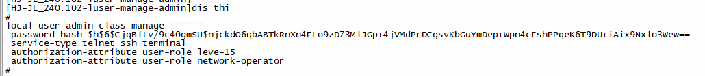 被你一说,仔细看了一下,level少了个l, local-user admin class manage--- password hash xxxxx----- service-type telnet ssh terminal--------- authorization-attribute user-role leve-15--------- authorization-attribute user-role network-operator-------