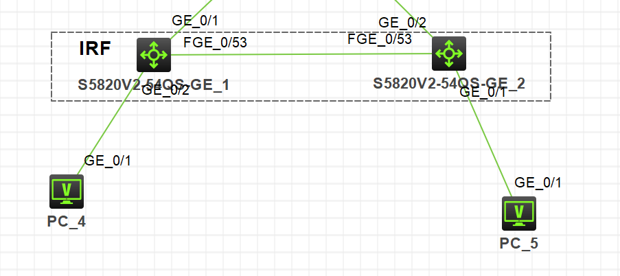 3、假设PC_4和PC_5有双链路链接到已经部署了IRF的6520上,且做了链路聚合,在正常情况下,PC_4和PC_5先到1号机再进行转发。如果1号机断电了,则走2号机。当1号机起来后,还是先走2号机。