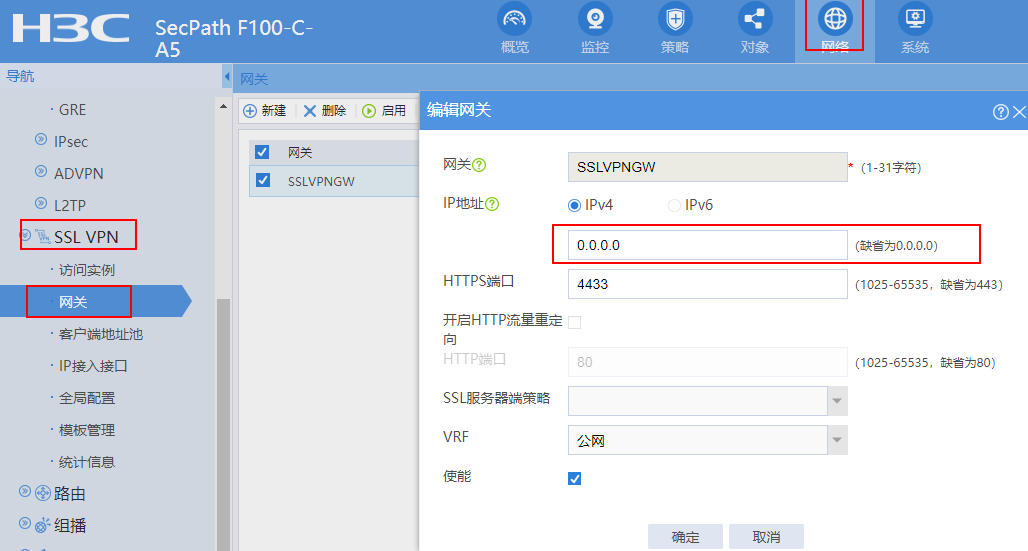 F100-C-A5防火墙,SSL VPN 网关地址该填写什么,默认是0.0.0.0,客户没有公网ip,使用ddns来建立ssl vpn。