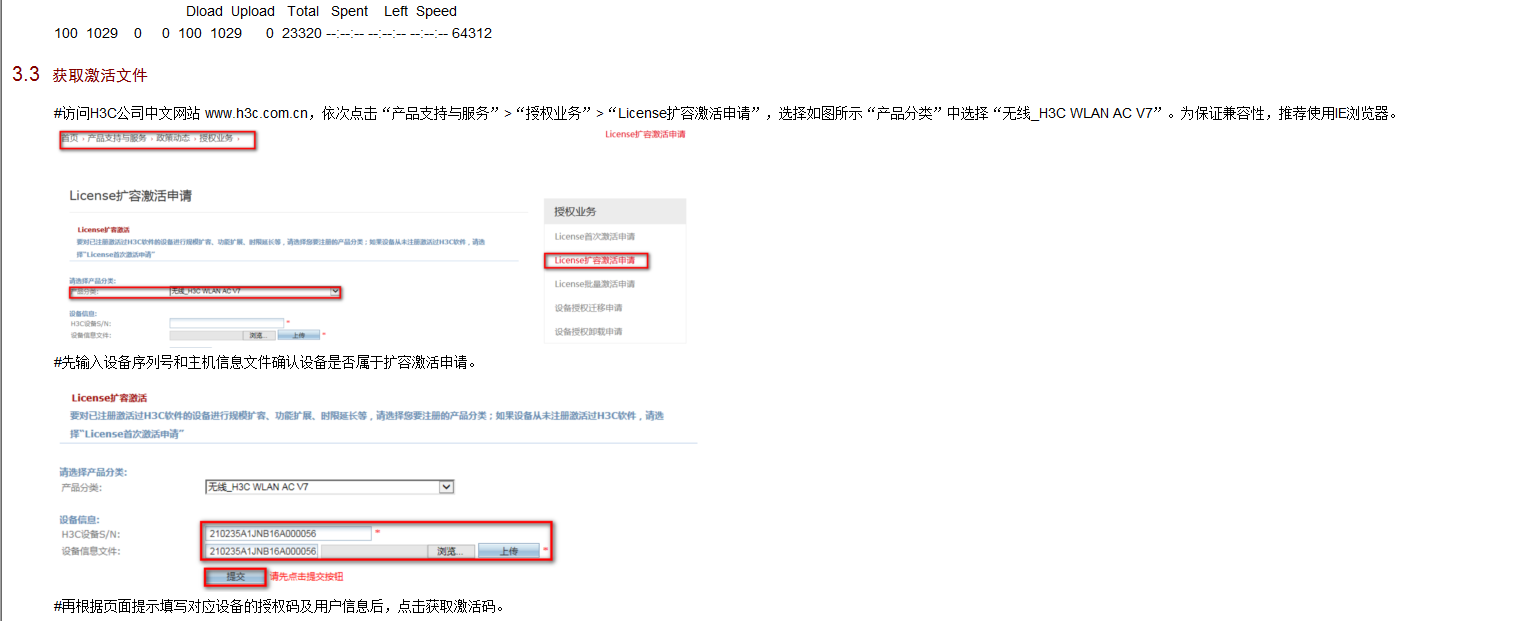 2.登录华三授权注册界面https://www.h3c.com/cn/Service/Policy_Trends/Authorize_License/License_Enlarge_Apply/,若之前有授权,注意选择扩容申请,输入授权码后,选择无线V7V9,提交后,把对应的信息输入进去以及did文件导入,邮箱一定要填写准确,用来下载授权.ak文件,申请授权,