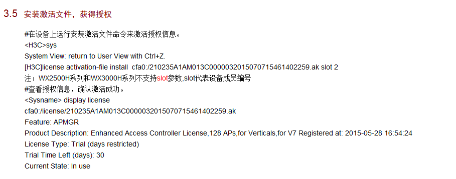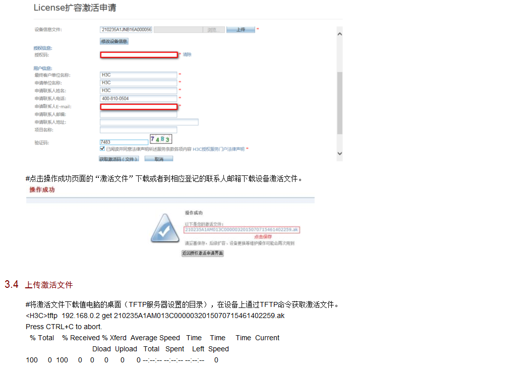 3、在www.h3c.com.cn网站上注册获取激活码。首次激活需提交的注册信息包括:授权码(即License-key)、设备S/N、设备信息DID文件等。具体操作方法见下一节“License激活申请”。