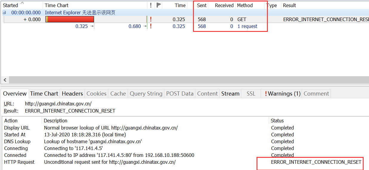 可以正常解析税务网地址(***.***),但是就是打不开网页,用httpWatch抓包如下图: