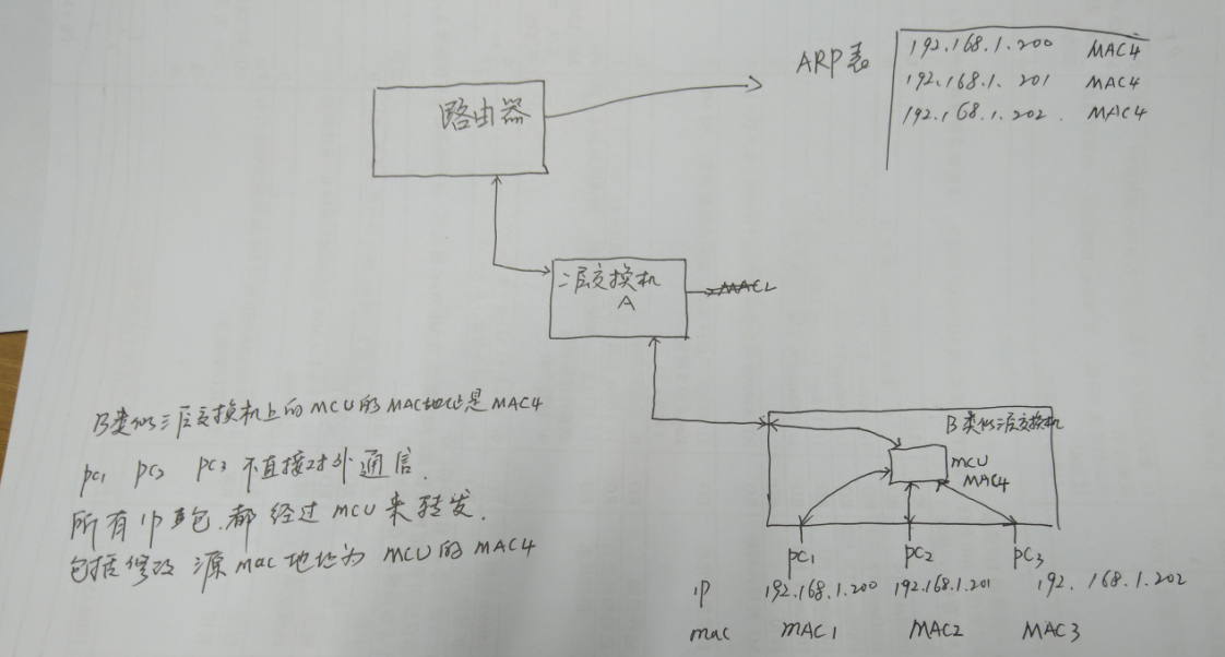 问题是这样的 路由器下边连接一个二层交换机A,在交换机A的下边连接一个设备 B,B类似一个三层交换机,设备B上边连接这几台电脑PC1、PC2、PC3,在路由器上查看到的ARP表,PC1、PC2、PC3的IP地址分别是192.168.1.200、192.168.1.201、192.168.1.202,对应的地址都是B设备的MAC地址。