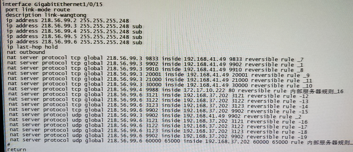 做了个内网192.168.37.202 映射到218.56.99.6的映射,映射端口有3121-3123 的tcp和udp; 9902的 tcp和udp ;60000-65000 udp;上面映射的命令对不对?如何验证正确与否,还需要配置安全策略么?现在安全策略里面没有任何配置。原来可以直接telnet到218.56.99.3端口,现在telnet也没有反应了。
