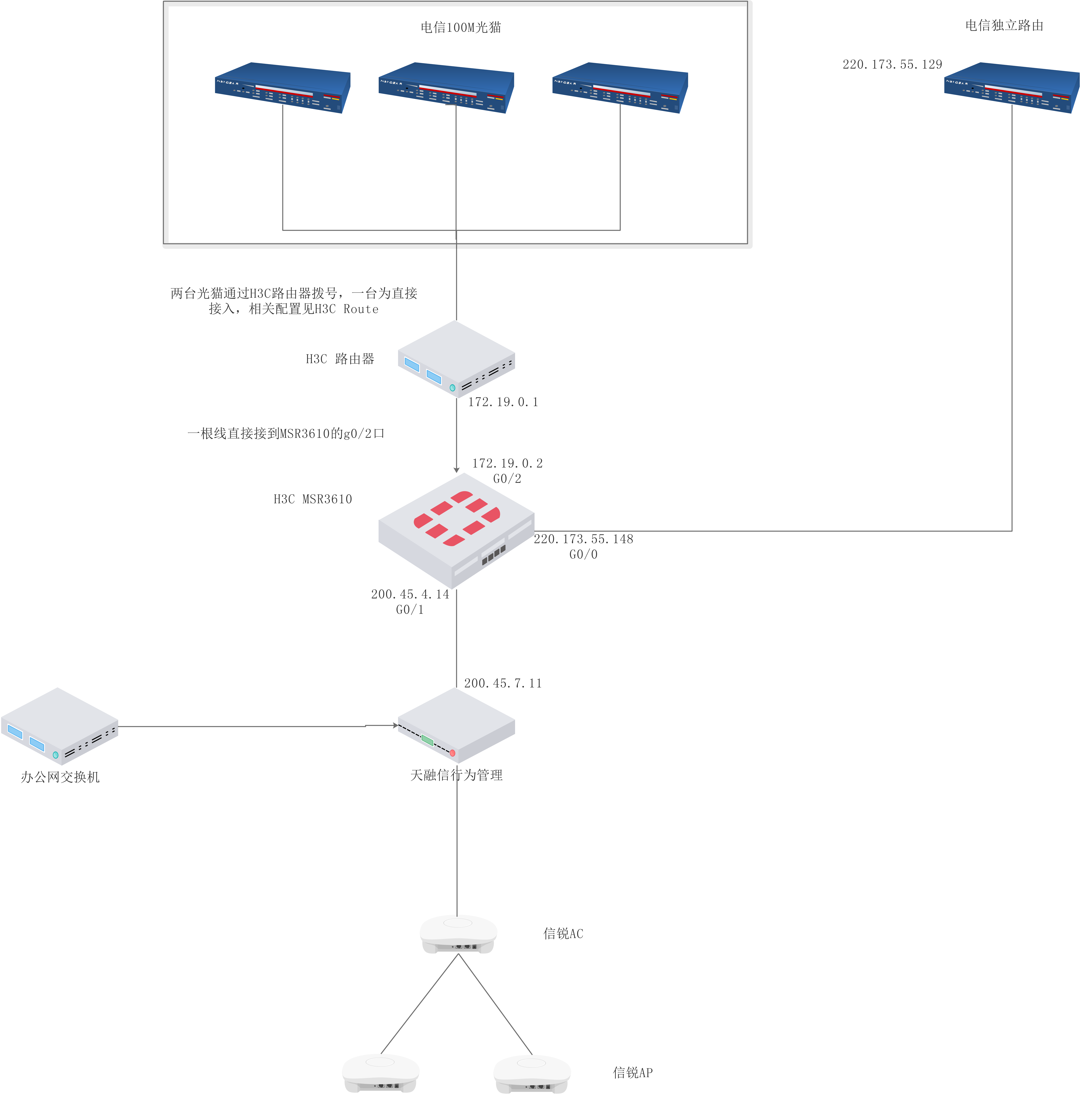 原本客户的规划是无线AC通过MSR3610走那三个电信100M的光猫,办公网走的是220段的办公网络但现在的情况是所有的网络默认出口都是220段Ping的结果首先到网关,然后到200.45.7.11(天融信行为管理),然后到MSR3610,然后就直接从220.173.55.129出去了尝试删掉MSR3610上的0.0.0.0的那行默认路由,但发现并无效果,所以想咨询这应该怎么去配置呢?
