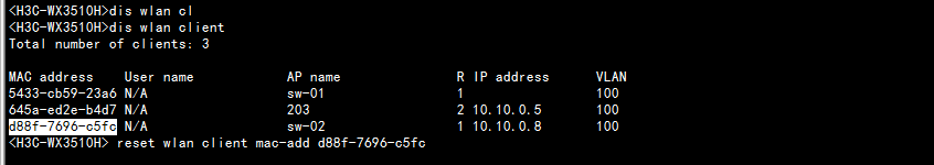<Sysname> reset wlan client mac-add xxxx
