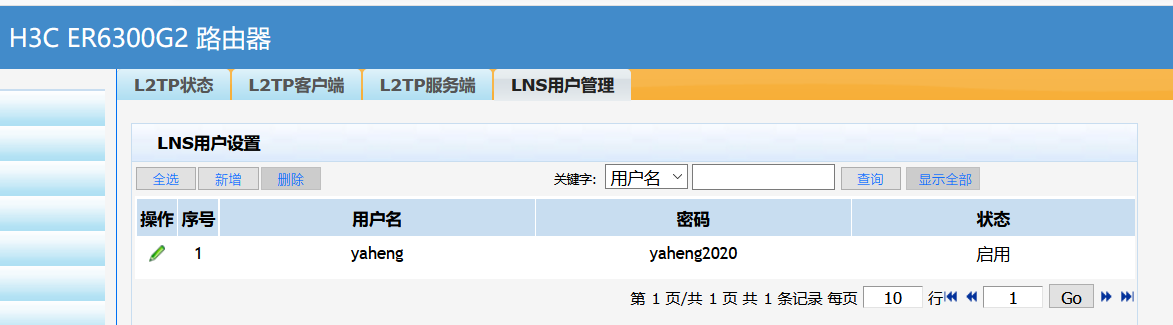 页面向导:VPN→L2TP VPN→LNS用户管理