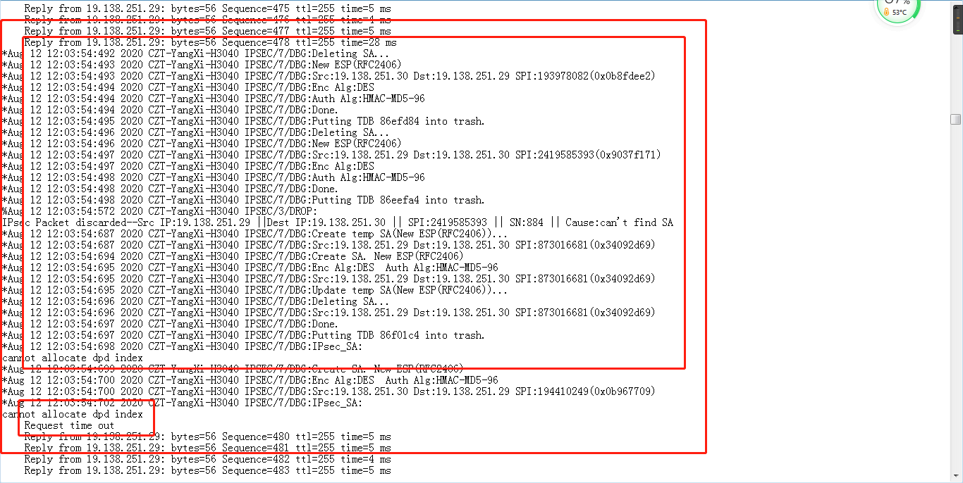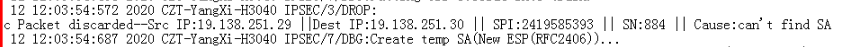 如图,每次sa更新的时候,数据会有丢包的情况出现,线路测试是没用问题的,现在造成0.4%-1%的丢包情况,更新了MSR3640的版本,但是只有15年的,故障还是有出现 Reply from 19.138.251.29: bytes=56 Sequence=477 ttl=255 time=5 ms Reply from 19.138.251.29: bytes=56 Sequence=478 ttl=255 time=28 ms *Aug 12 12:03:54:492 2020 CZT-YangXi-H3040 IPSEC/7/DBG:Deleting SA... *Aug 12 12:03:54:493 2020 CZT-YangXi-H3040 IPSEC/7/DBG:New ESP(RFC2406) *Aug 12 12:03:54:493 2020 CZT-YangXi-H3040 IPSEC/7/DBG:Src:19.138.251.30 Dst:19.138.251.29 SPI:193978082(0x0b8fdee2) *Aug 12 12:03:54:494 2020 CZT-YangXi-H3040 IPSEC/7/DBG:Enc Alg:DES *Aug 12 12:03:54:494 2020 CZT-YangXi-H3040 IPSEC/7/DBG:Auth Alg:HMAC-MD5-96 *Aug 12 12:03:54:494 2020 CZT-YangXi-H3040 IPSEC/7/DBG:Done. *Aug 12 12:03:54:495 2020 CZT-YangXi-H3040 IPSEC/7/DBG:Putting TDB 86efd84 into trash. *Aug 12 12:03:54:496 2020 CZT-YangXi-H3040 IPSEC/7/DBG:Deleting SA... *Aug 12 12:03:54:496 2020 CZT-YangXi-H3040 IPSEC/7/DBG:New ESP(RFC2406) *Aug 12 12:03:54:497 2020 CZT-YangXi-H3040 IPSEC/7/DBG:Src:19.138.251.29 Dst:19.138.251.30 SPI:2419585393(0x9037f171) *Aug 12 12:03:54:497 2020 CZT-YangXi-H3040 IPSEC/7/DBG:Enc Alg:DES *Aug 12 12:03:54:498 2020 CZT-YangXi-H3040 IPSEC/7/DBG:Auth Alg:HMAC-MD5-96 *Aug 12 12:03:54:498 2020 CZT-YangXi-H3040 IPSEC/7/DBG:Done. *Aug 12 12:03:54:498 2020 CZT-YangXi-H3040 IPSEC/7/DBG:Putting TDB 86eefa4 into trash. %Aug 12 12:03:54:572 2020 CZT-YangXi-H3040 IPSEC/3/DROP: IPsec Packet discarded--Src IP:19.138.251.29 ||Dest IP:19.138.251.30 || SPI:2419585393 || SN:884 || Cause:can't find SA *Aug 12 12:03:54:687 2020 CZT-YangXi-H3040 IPSEC/7/DBG:Create temp SA(New ESP(RFC2406))... *Aug 12 12:03:54:687 2020 CZT-YangXi-H3040 IPSEC/7/DBG:Src:19.138.251.29 Dst:19.138.251.30 SPI:873016681(0x34092d69) *Aug 12 12:03:54:694 2020 CZT-YangXi-H3040 IPSEC/7/DBG:Create SA. New ESP(RFC2406) *Aug 12 12:03:54:695 2020 CZT-YangXi-H3040 IPSEC/7/DBG:Enc Alg:DES Auth Alg:HMAC-MD5-96 *Aug 12 12:03:54:695 2020 CZT-YangXi-H3040 IPSEC/7/DBG:Src:19.138.251.29 Dst:19.138.251.30 SPI:873016681(0x34092d69) *Aug 12 12:03:54:695 2020 CZT-YangXi-H3040 IPSEC/7/DBG:Update temp SA(New ESP(RFC2406))... *Aug 12 12:03:54:696 2020 CZT-YangXi-H3040 IPSEC/7/DBG:Deleting SA... *Aug 12 12:03:54:696 2020 CZT-YangXi-H3040 IPSEC/7/DBG:Src:19.138.251.29 Dst:19.138.251.30 SPI:873016681(0x34092d69) *Aug 12 12:03:54:697 2020 CZT-YangXi-H3040 IPSEC/7/DBG:Done. *Aug 12 12:03:54:697 2020 CZT-YangXi-H3040 IPSEC/7/DBG:Putting TDB 86f01c4 into trash. *Aug 12 12:03:54:698 2020 CZT-YangXi-H3040 IPSEC/7/DBG:IPsec_SA: cannot allocate dpd index *Aug 12 12:03:54:699 2020 CZT-YangXi-H3040 IPSEC/7/DBG:Create SA. New ESP(RFC2406) *Aug 12 12:03:54:700 2020 CZT-YangXi-H3040 IPSEC/7/DBG:Enc Alg:DES Auth Alg:HMAC-MD5-96 *Aug 12 12:03:54:700 2020 CZT-YangXi-H3040 IPSEC/7/DBG:Src:19.138.251.30 Dst:19.138.251.29 SPI:194410249(0x0b967709) *Aug 12 12:03:54:702 2020 CZT-YangXi-H3040 IPSEC/7/DBG:IPsec_SA: cannot allocate dpd index Request time out Reply from 19.138.251.29: bytes=56 Sequence=480 ttl=255 time=5 ms Reply from 19.138.251.29: bytes=56 Sequence=481 ttl=255 time=5 ms