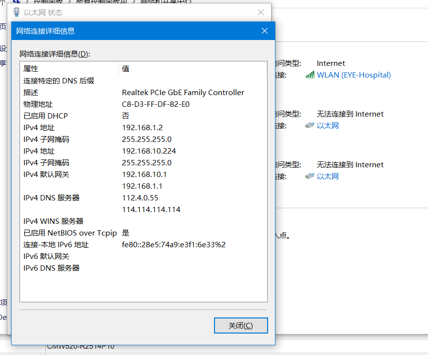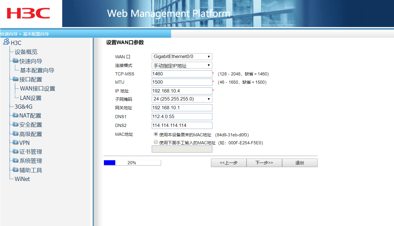 单位外网访问需要绑定MAC,本地PC是绑定Mac地址的,地址是192.168.10.224,现给路由器绑定MAC地址为192.168.10.4,绑定以后路由器GE0口接外网网线,GELAN1口接网线至PC,路由配置信息如下:设置wan参数手动IP,192.168.10.4。设置lan口参数,开启DHCP服务,192.168.1.2开始只192.168.1.254 。配置下一步信息完成。并且给本地PC手动增加192.168.1.2网址,使PC为双网址。配置完成后,路由器INTERNET灯不亮,本地PC也无法访问外网(网页、客户端等应用均不可,网络连接显示感叹号)