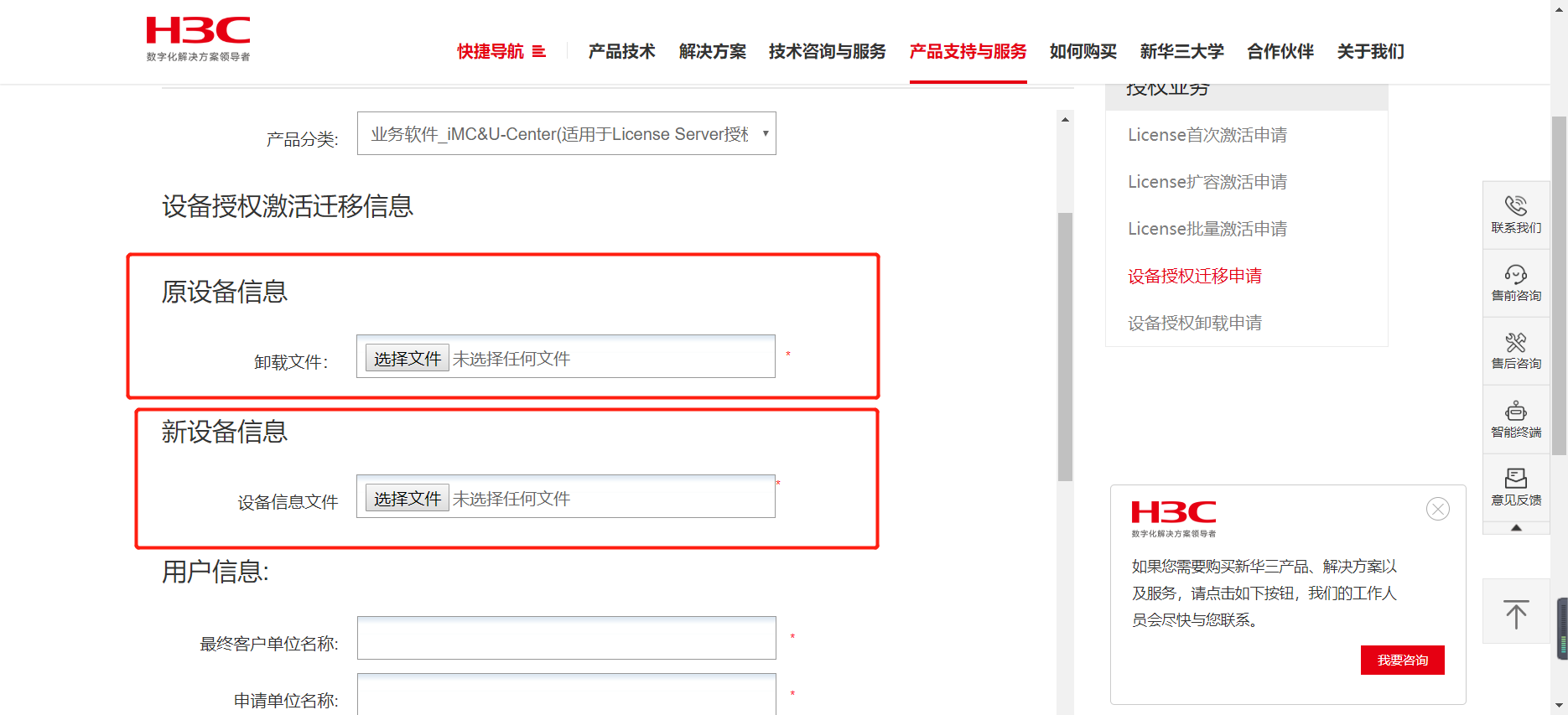 你选择错啦,IMC授权变更需要找400,提交授权变更申请书,你这里选择的是u-center,不是一个产品,IMC授权无法自助申请变更。