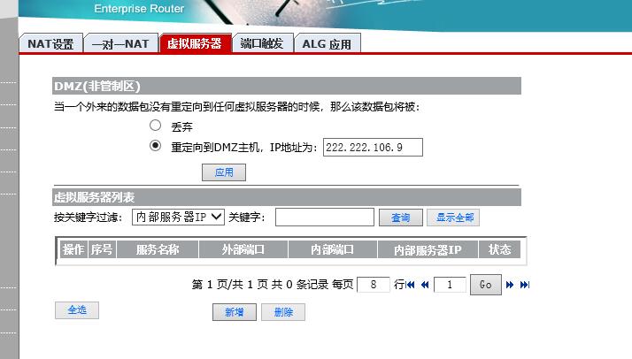 · 设置当虚拟服务器列表中如果不存在对应的映射项时,对报文的处理方式(主页面。选择“丢弃”或“重定向到DMZ主机”,单击<应用>按钮生效) |
