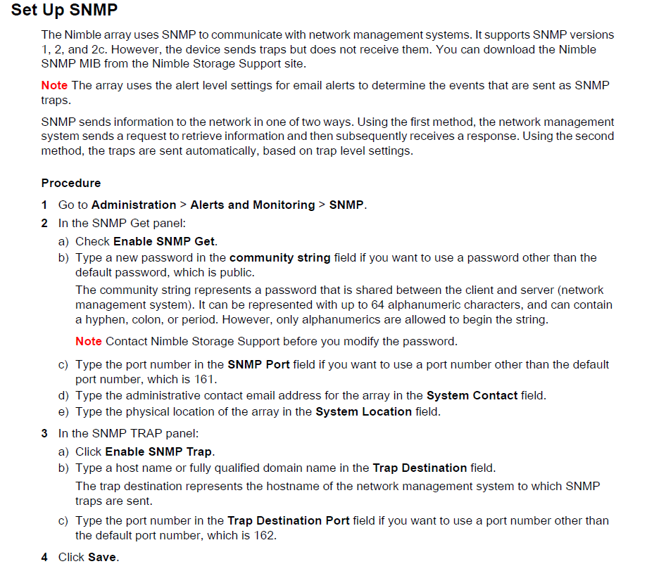 Nimble存储可以用SNMPv1、v2和v2c支持 SNMP GET和TRAP。