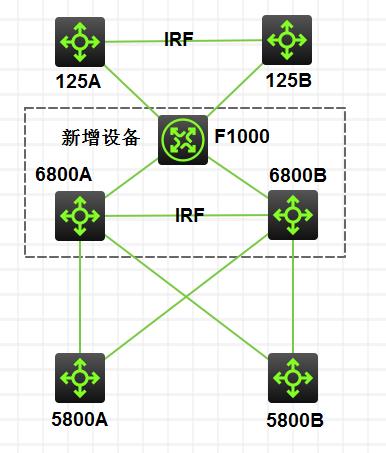 如下图所示,用户机房原有两台125交换机做了堆叠,最下面的两台5800直接连接至两台125上面,现在想增加一台F1000防火墙和两台6800交换机,两台6800交换机做IRF,像这种情况,有几个问题