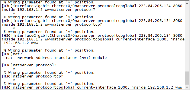 您好,我看到您端口的命令和nat server的命令连接再一起了。