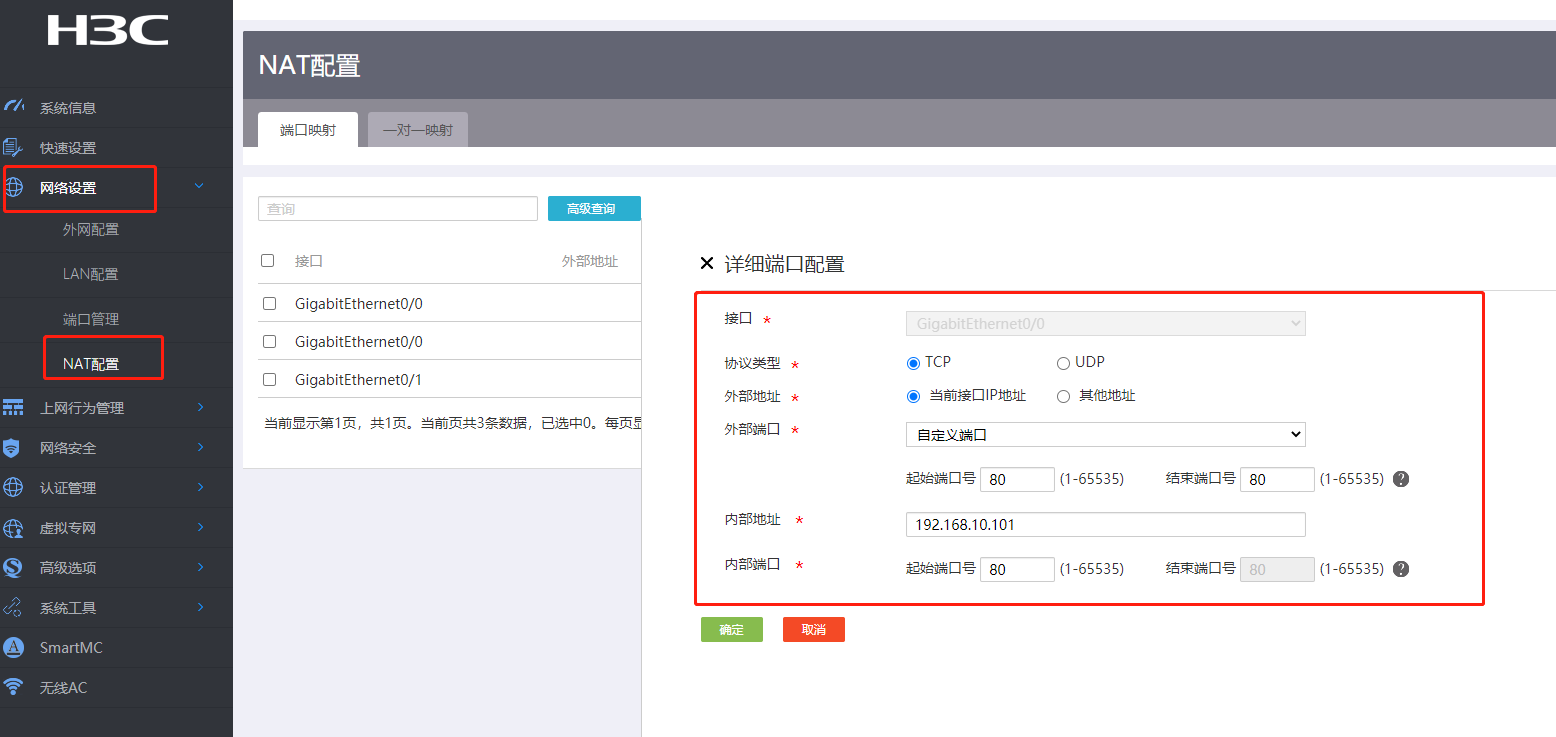 我想通过外网访问,通过路由器的80端口映射到内网服务器80端口。首先确认了外网开了80端口,(因为外网地址访问,就直接跳转到了路由器首页)。目前修改了路由器-》网络设置-》NAT配置,配置了80端口映射。外网访问不成功,随即修改路由器-》系统工具-》远程管理-》http-》80端口改成801。外网IP访问后会变成XXXX/web/index.html,不会映射到内网80.