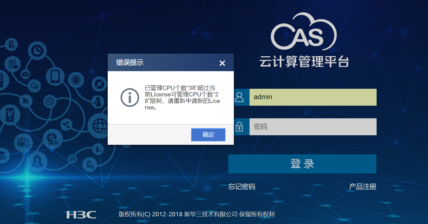 根据提示是CPU的管理数超过了license的授权规格,需确认下是否有新部署虚拟机或者做了虚拟机的迁移等操作。