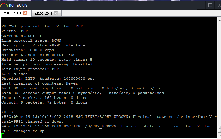 *Apr 19 13:46:15:933 2018 H3C PPP/7/FSM_EVENT_0: PPP Event: VPPP1(84) LCP RCR+(Receive Config Good Request) Event State closed *Apr 19 13:46:15:933 2018 H3C PPP/7/FSM_PACKET_0: PPP Packet: VPPP1(84) Output LCP(c021) Packet, PktLen 8 Current State closed, code TermAck(06), id 4, len 4 *Apr 19 13:46:18:796 2018 H3C PPP/7/EXTERNAL_EVENT: PPP External Event: Virtual-PPP1 deliver packet to user space success *Apr 19 13:46:18:796 2018 H3C PPP/7/FSM_PACKET_0: PPP Packet: VPPP1(84) Input LCP(c021) Packet, PktLen 18 Current State closed, code ConfReq(01), id 5, len 14 AuthProto(3), len 4, PAP c0 23 MagicNumber(5), len 6, val 1a ad 33 f0 *Apr 19 13:46:18:796 2018 H3C PPP/7/FSM_EVENT_0: PPP Event: VPPP1(84) LCP RCR+(Receive Config Good Request) Event State closed *Apr 19 13:46:18:796 2018 H3C PPP/7/FSM_PACKET_0: PPP Packet: VPPP1(84) Output LCP(c021) Packet, PktLen 8 Current State closed, code TermAck(06), id 5, len 4 *Apr 19 13:46:21:627 2018 H3C PPP/7/EXTERNAL_EVENT: PPP External Event: Virtual-PPP1 deliver packet to user space success *Apr 19 13:46:21:627 2018 H3C PPP/7/FSM_PACKET_0: PPP Packet: VPPP1(84) Input LCP(c021) Packet, PktLen 18 Current State closed, code ConfReq(01), id 6, len 14 AuthProto(3), len 4, PAP c0 23 MagicNumber(5), len 6, val 4e 0e 1a 46 *Apr 19 13:46:21:627 2018 H3C PPP/7/FSM_EVENT_0: PPP Event: VPPP1(84) LCP RCR+(Receive Config Good Request) Event State closed *Apr 19 13:46:21:627 2018 H3C PPP/7/FSM_PACKET_0: PPP Packet: VPPP1(84) Output LCP(c021) Packet, PktLen 8 Current State closed, code TermAck(06), id 6, len 4 *Apr 19 13:46:24:480 2018 H3C PPP/7/EXTERNAL_EVENT: PPP External Event: Virtual-PPP1 deliver packet to user space success *Apr 19 13:46:24:481 2018 H3C PPP/7/FSM_PACKET_0: PPP Packet: VPPP1(84) Input LCP(c021) Packet, PktLen 18 Current State closed, code ConfReq(01), id 7, len 14 AuthProto(3), len 4, PAP c0 23 MagicNumber(5), len 6, val e1 02 8c 86 *Apr 19 13:46:24:481 2018 H3C PPP/7/FSM_EVENT_0: PPP Event: VPPP1(84) LCP RCR+(Receive Config Good Request) Event State closed *Apr 19 13:46:24:481 2018 H3C PPP/7/FSM_PACKET_0: PPP Packet: VPPP1(84) Output LCP(c021) Packet, PktLen 8 Current State closed, code TermAck(06), id 7, len 4 *Apr 19 13:46:27:313 2018 H3C PPP/7/EXTERNAL_EVENT: PPP External Event: Virtual-PPP1 deliver packet to user space success *Apr 19 13:46:27:313 2018 H3C PPP/7/FSM_PACKET_0: PPP Packet: VPPP1(84) Input LCP(c021) Packet, PktLen 18 Current State closed, code ConfReq(01), id 8, len 14 AuthProto(3), len 4, PAP c0 23 MagicNumber(5), len 6, val b2 6d 79 5e *Apr 19 13:46:27:313 2018 H3C PPP/7/FSM_EVENT_0: PPP Event: VPPP1(84) LCP RCR+(Receive Config Good Request) Event State closed *Apr 19 13:46:27:313 2018 H3C PPP/7/FSM_PACKET_0: PPP Packet: VPPP1(84) Output LCP(c021) Packet, PktLen 8 Current State closed, code TermAck(06), id 8, len 4 *Apr 19 13:46:30:143 2018 H3C PPP/7/EXTERNAL_EVENT: PPP External Event: Virtual-PPP1 deliver packet to user space success *Apr 19 13:46:30:144 2018 H3C PPP/7/FSM_PACKET_0: PPP Packet: VPPP1(84) Input LCP(c021) Packet, PktLen 18 Current State closed, code ConfReq(01), id 9, len 14 AuthProto(3), len 4, PAP c0 23 MagicNumber(5), len 6, val 29 fa 6e 28 *Apr 19 13:46:30:144 2018 H3C PPP/7/FSM_EVENT_0: PPP Event: VPPP1(84) LCP RCR+(Receive Config Good Request) Event State closed *Apr 19 13:46:30:144 2018 H3C PPP/7/FSM_PACKET_0: PPP Packet: VPPP1(84) Output LCP(c021) Packet, PktLen 8 Current State closed, code TermAck(06), id 9, len 4 %Apr 19 13:46:32:975 2018 H3C IFNET/3/PHY_UPDOWN: Physical state on the interface Virtual-PPP1 changed to down. *Apr 19 13:46:32:975 2018 H3C PPP/7/EXTERNAL_EVENT_0: PPP External Event: VPPP1(84): PPP daemon receive interface down event! *Apr 19 13:46:32:975 2018 H3C PPP/7/FSM_EVENT_0: PPP Event: VPPP1(84) LCP Lower Down Event State closed *Apr 19 13:46:32:975 2018 H3C PPP/7/FSM_STATE_0: PPP State Change: VPPP1(84) LCP: closed --> initial *Apr 19 13:46:32:975 2018 H3C PPP/7/FSM_EVENT_0: PPP Event: VPPP1(84) LCP Close Event State initial *Apr 19 13:46:34:561 2018 H3C PPP/7/EXTERNAL_EVENT_0: PPP External Event: VPPP1(84): PPP daemon receive interface up event! *Apr 19 13:46:34:561 2018 H3C PPP/7/EXTERNAL_EVENT_0: PPP External Event: VPPP1(84): PPP daemon enter lcp establish flow! *Apr 19 13:46:34:562 2018 H3C PPP/7/EXTERNAL_EVENT: PPP External Event: Virtual-PPP1 deliver packet to user space success *Apr 19 13:46:34:561 2018 H3C PPP/7/FSM_EVENT_0: PPP Event: VPPP1(84) LCP Open Event State initial *Apr 19 13:46:34:561 2018 H3C PPP/7/FSM_STATE_0: PPP State Change: VPPP1(84) LCP: initial --> starting *Apr 19 13:46:34:561 2018 H3C PPP/7/FSM_EVENT_0: PPP Event: VPPP1(84) LCP Lower Up Event State starting *Apr 19 13:46:34:561 2018 H3C PPP/7/FSM_STATE_0: PPP State Change: VPPP1(84) LCP: starting --> reqsent *Apr 19 13:46:34:561 2018 H3C PPP/7/FSM_PACKET_0: PPP Packet: VPPP1(84) Output LCP(c021) Packet, PktLen 18 Current State reqsent, code ConfReq(01), id 36, len 14 AuthProto(3), len 4, PAP c0 23 MagicNumber(5), len 6, val 9b d8 75 7f *Apr 19 13:46:34:562 2018 H3C PPP/7/FSM_PACKET_0: PPP Packet: VPPP1(84) Input LCP(c021) Packet, PktLen 18 Current State reqsent, code ConfReq(01), id 0, len 14 AuthProto(3), len 4, PAP c0 23 MagicNumber(5), len 6, val b7 99 ec cd *Apr 19 13:46:34:562 2018 H3C PPP/7/EXTERNAL_EVENT: PPP External Event: Virtual-PPP1 deliver packet to user space success *Apr 19 13:46:34:562 2018 H3C PPP/7/FSM_EVENT_0: PPP Event: VPPP1(84) LCP RCR+(Receive Config Good Request) Event State reqsent *Apr 19 13:46:34:562 2018 H3C PPP/7/FSM_PACKET_0: PPP Packet: VPPP1(84) Output LCP(c021) Packet, PktLen 18 Current State reqsent, code ConfAck(02), id 0, len 14 AuthProto(3), len 4, PAP c0 23 MagicNumber(5), len 6, val b7 99 ec cd *Apr 19 13:46:34:562 2018 H3C PPP/7/FSM_STATE_0: PPP State Change: VPPP1(84) LCP: reqsent --> acksent *Apr 19 13:46:34:562 2018 H3C PPP/7/FSM_PACKET_0: PPP Packet: VPPP1(84) Input LCP(c021) Packet, PktLen 12 Current State acksent, code ConfRej(04), id 36, len 8 AuthProto(
