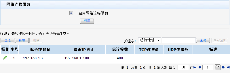 启用网络连接限数功能(主页面。选中“启用网络连接限数”复选框,单击<应用>按钮生效) | |
