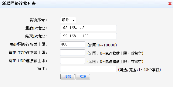 添加指定IP地址范围内每台主机同时发起的最大网络连接数(单击主页面上的<新增>按钮,在弹出的对话框中设置相应参数,单击<增加>按钮完成操作) |