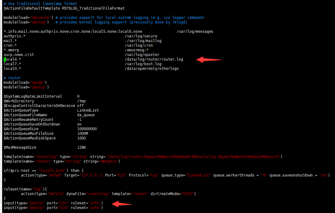 1、路由器是可以直接通 rsyslog服务器 2、没有开防火墙 3、没有中间安全设备 另外 我这个rsyslog配置是哪里有问题嘛,应该怎么改才可以 或者说你们是怎么发送到日志服务器的呀?