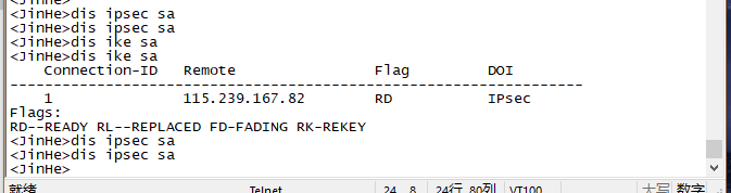 RD(READY):表示此IKE SA已建立成功 ,但是ike的第二阶段建不起来,主要核对下ipsec的安全提议以及ipsec policy视图下的配置是否跟对端匹配,核对配置没问题的话联系400确认吧