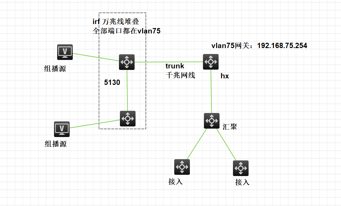 两台5130做irf后 旁挂在hx上,在5130上做二层组播(5130上有很多组播源)组播报文会大量的向hx发送,导致5130互联hx的链路带宽占慢,网络瘫痪,hx上没有开启组播igmp-snooping 如图: