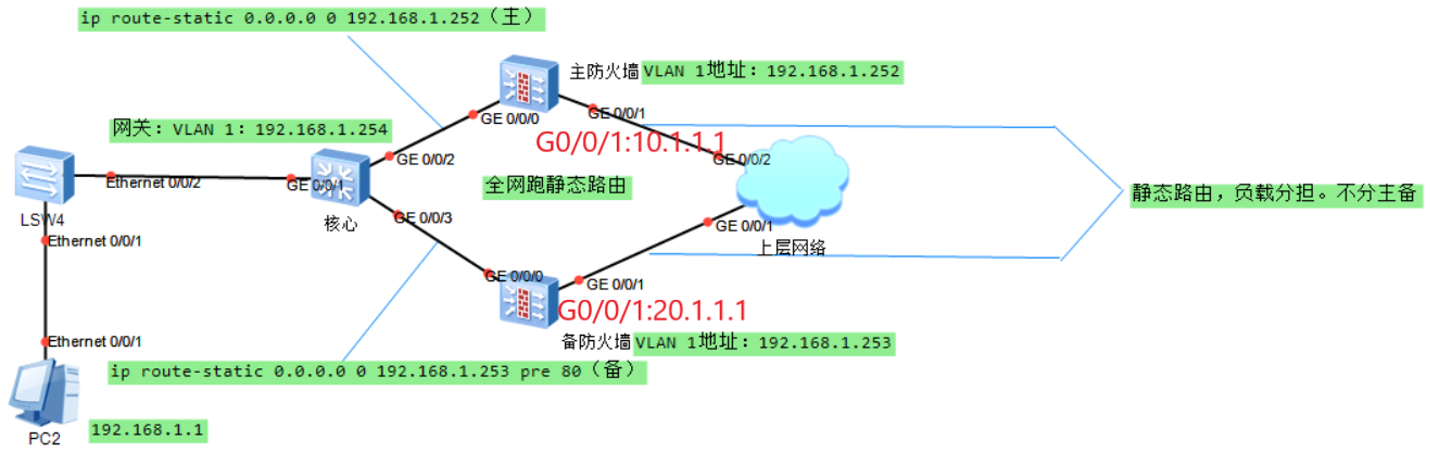 ip route-static 192.168.2.0 24 GigabitEthernet0/1 20.1.1.2 //配置备用静态路由,优先级为默认60