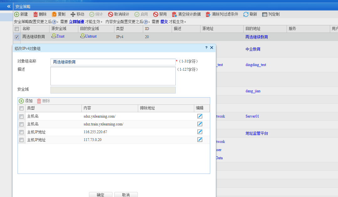 是这样的,某公司的安全策略较为严格,大部分网站都无法访问,现在要求新增加一个可访问的站点,于是我做了一个IPV4地址对象组,新增一个主机名为需要放通的站点,结果不好使,依然访问不了,于是我用nslookup解析了域名,把解析结果添加到了IPV4地址组,结果可以成功访问了;以前做过放通某个站点,用的是主机名方式,是没问题的,这回就不可以