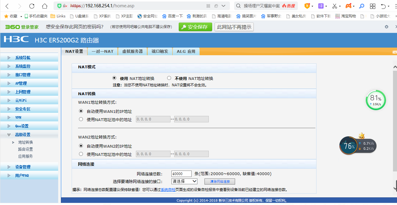 但是您是两个出口,选择“不使用NAT地址转换”的话,整台路由器的NAT地址转换就关闭了。