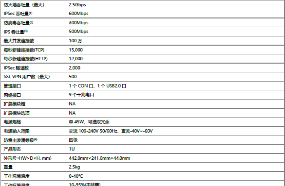 高可靠性 | 支持SCF 2:1虚拟化 支持双机状态热备(Active/Active和Active/Backup两种工作模式) 支持双机配置同步 支持IPSec VPN的IKE状态同步 支持VRRP | |||||