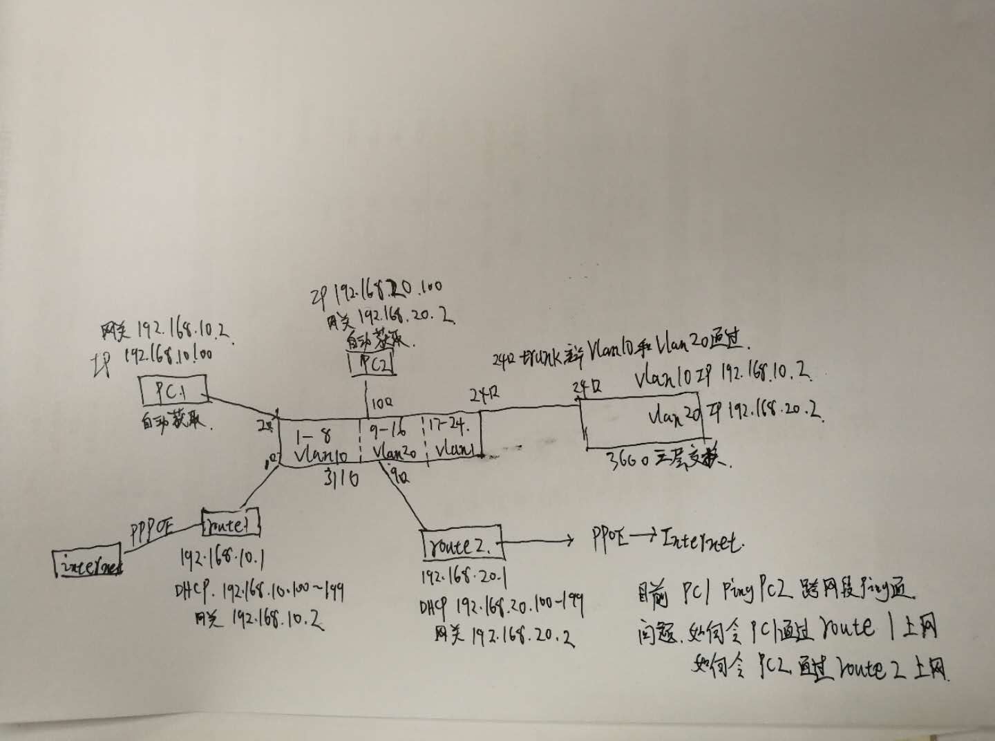配置如图我的3600SI没有DHCP server,所以用路由器开DHCP。试验过了pc1可以跨网段ping通pc2。路由器1和路由器2各接了一条宽带。查到说交换机要配置静态路由,路由器设置回程路由可以实现pc1通过route1上外网,pc2通过route2上外网。请问怎么设置的,就此图的具体配置命令。