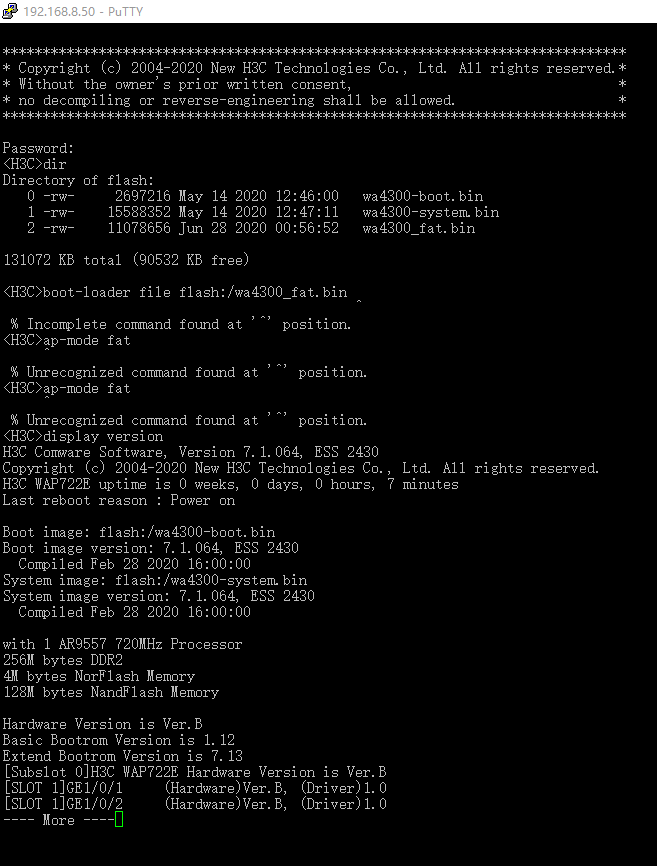wap722e没有console口,按教程操作,用telnet下载文件完了,然后输入ap-mode fat和boot-loader file flash:/wa4300_fat.bin都没反应