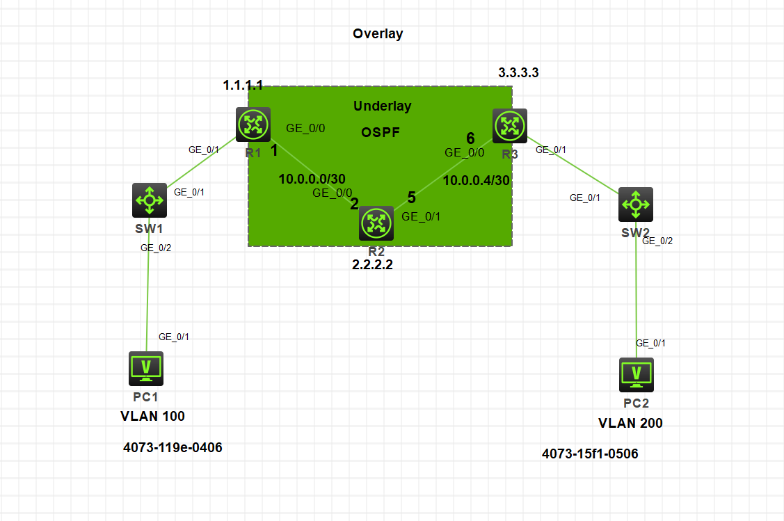 Underlay:底层IP网络,也就是绿色区域部分跑的传统协议ospf