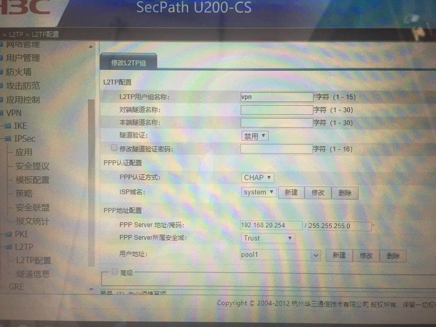 使用H3C U200防火墙的VPN功能已有近两个月,期间连接正常,今天突然有很多使用者反应无法连接,现将U200的L2TP、客户端VPN设置界面及报错界面提交,请帮助查看问题出在哪里,谢谢!