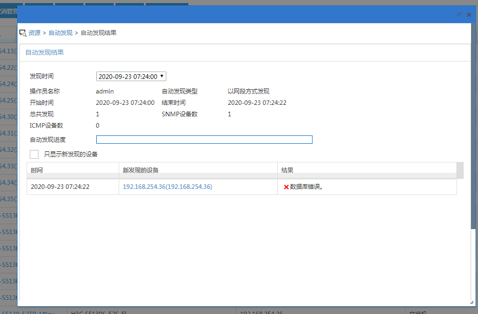 有台交换机在imc平台上点击自动发现以后识别成pc,我从资源管理内将其删除,另外登陆交换机设置snmp后返回IMC平台添加设备并选择相关ssh参数和snmp参数,就提示数据库失败。 是什么问题,更改了这台交换机IP后再添加也是一样的毛病。求解